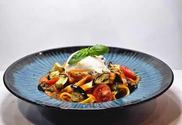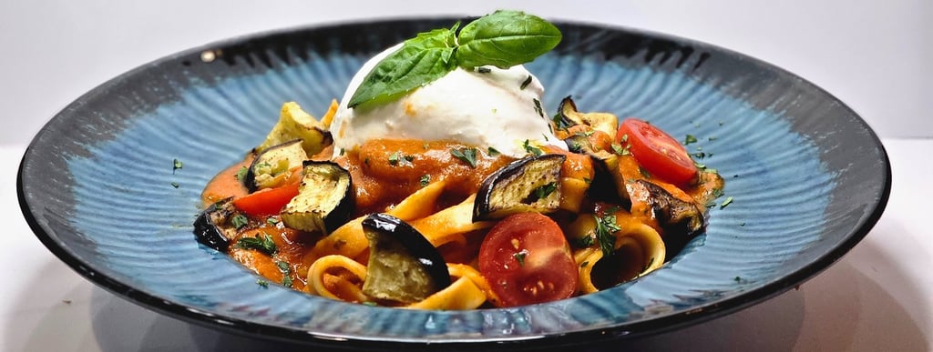 Smażony bakłażan, pomidorki koktailowe z soczystym sosem pomidorowym z dodatkiem burraty.
